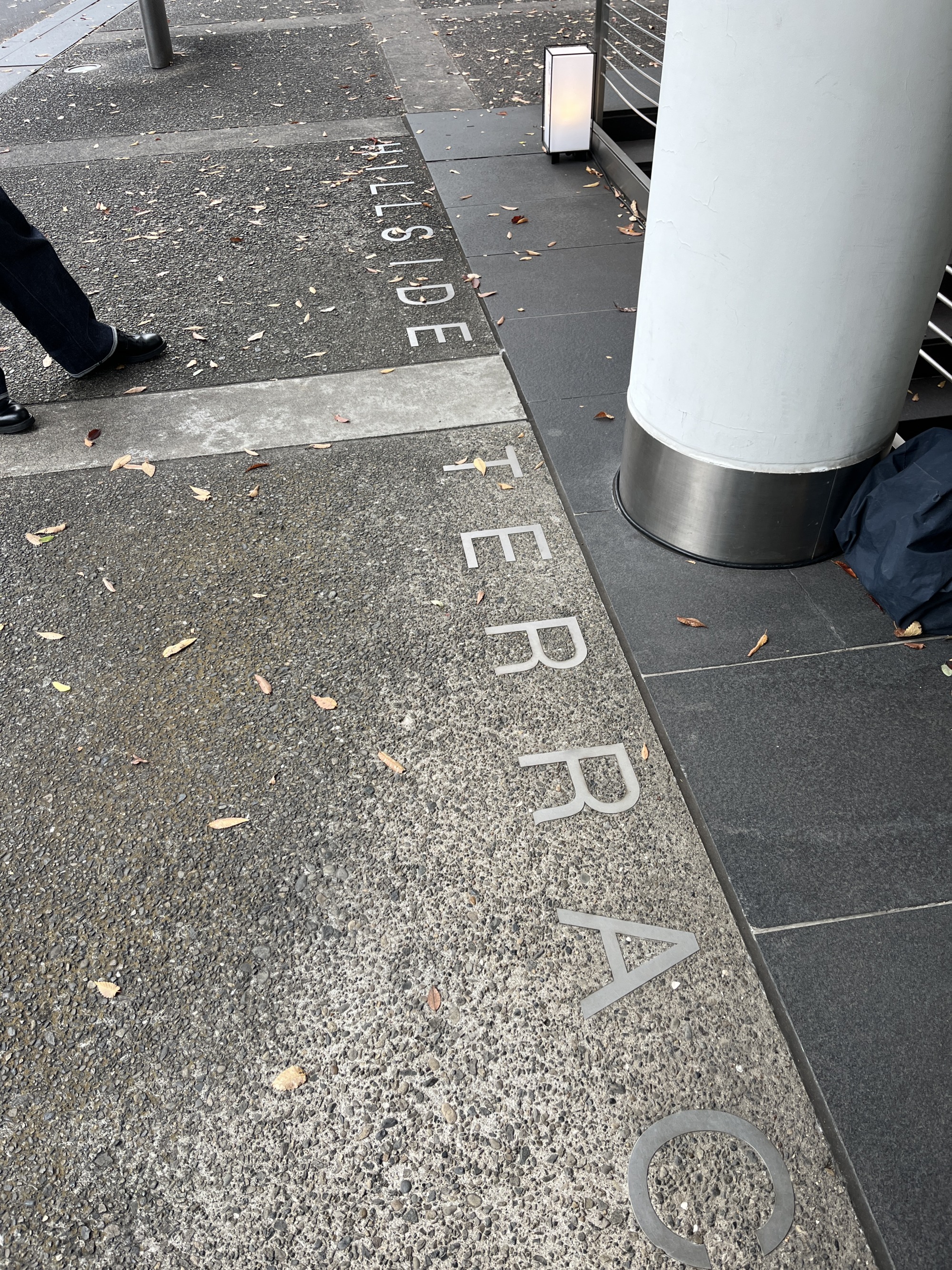 F棟とG棟の間 それぞれの棟にコモンが配されている。どれも個性的な設えなのですが一貫性がある。所々にテーブルと椅子があり思い思いの時間を過ごせる。色々見ていると足元のデザインが周到である事に気づいた。