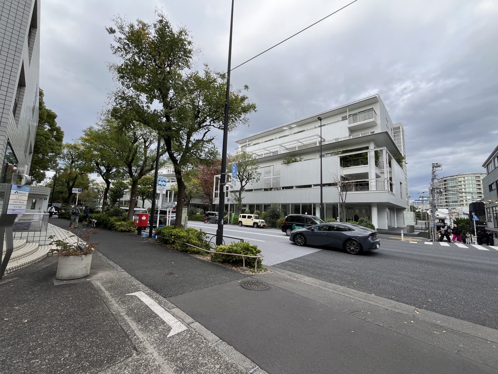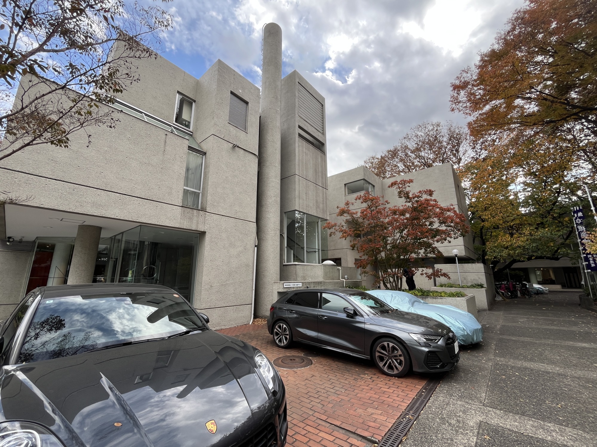旧山手通り越しにF棟を見る この無機質な感じのファサードを見ると一瞬突き放されたような誤解をしてしまうのは私だけでしょうか。しかしつい足を踏み入れたくなる感じは既存地形を活かしながら幾何学的な建築を用いて記号的リズムを作り地形、植物によってヒューマンな場所を作り出している、という対比によるものか。
