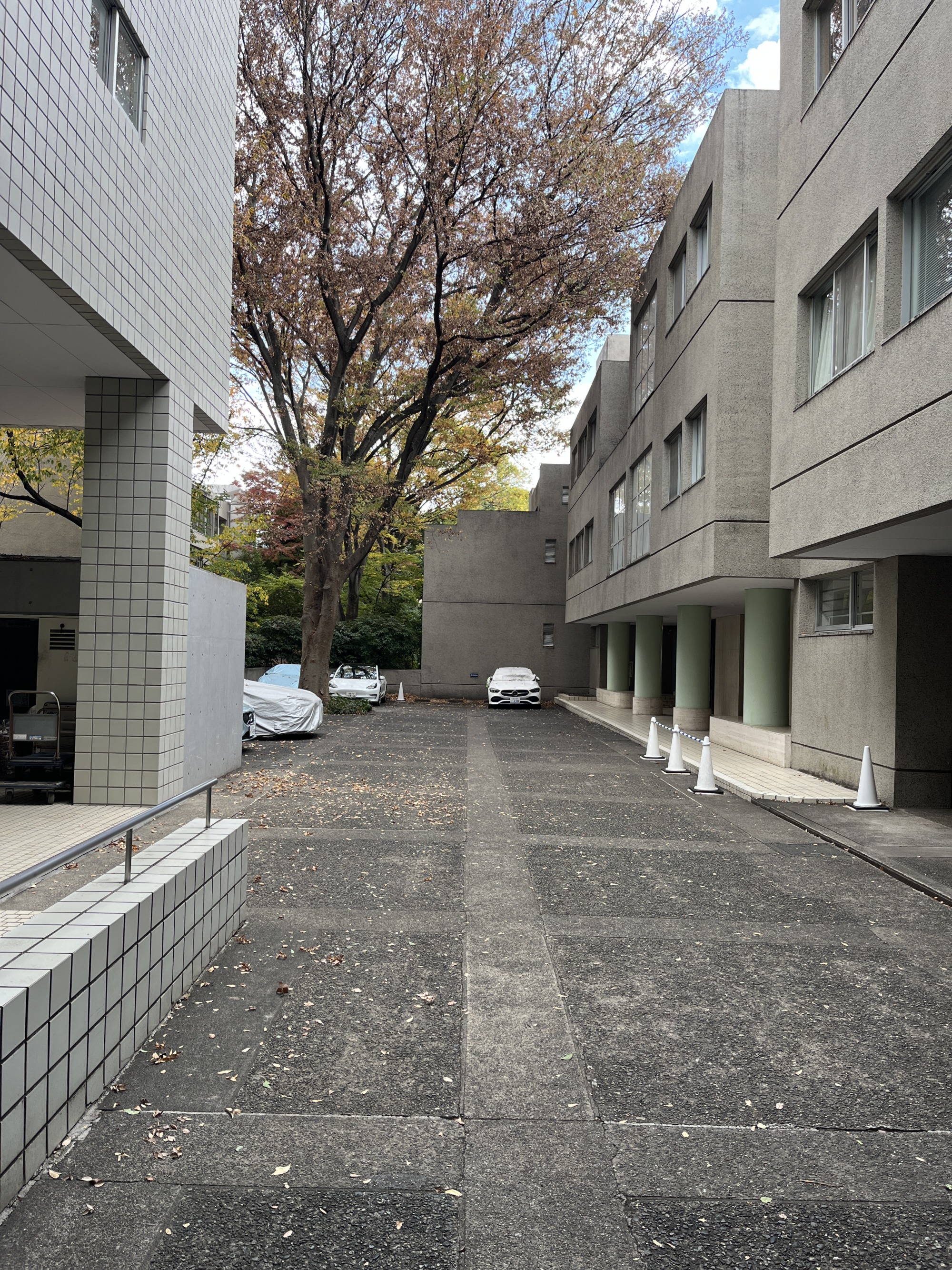 E棟とD棟の間の駐車スペース 猿楽塚が隣にある。